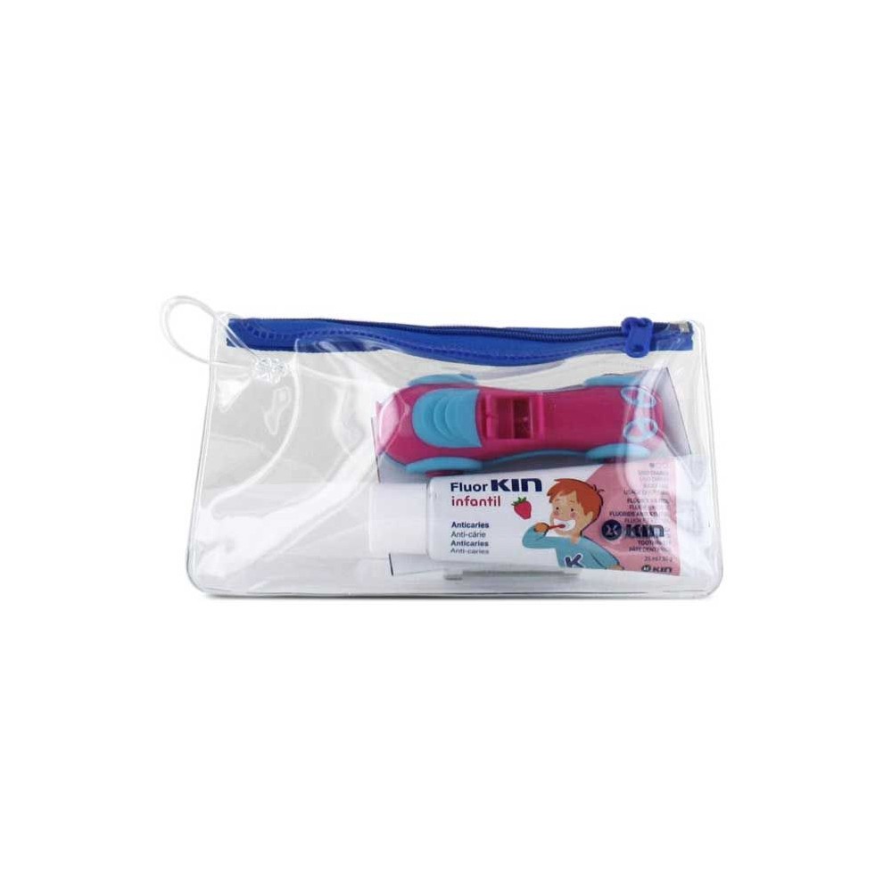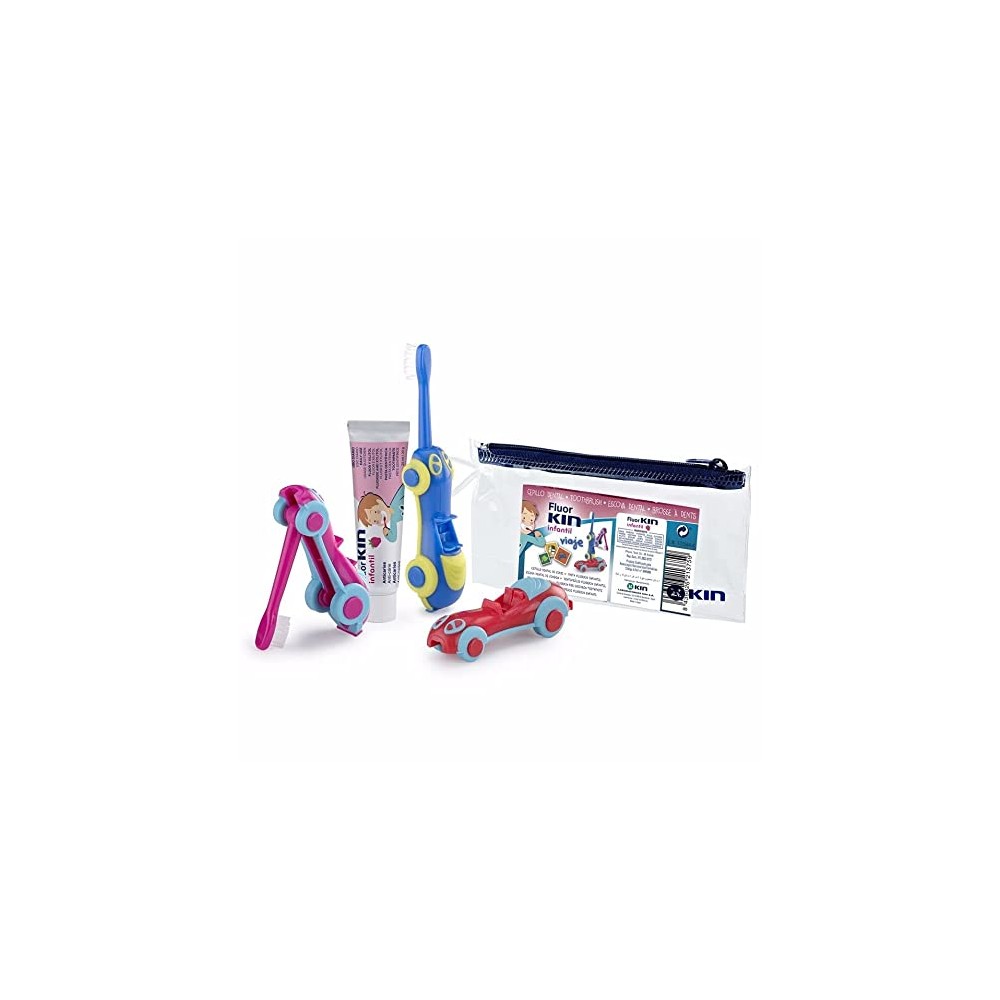 Se trata de un estuche compuesto por un cepillo infantil de viaje de punta redondeada para el cuidado bucal de los más pequeños y de una pasta de dientes Fluorkin Infantil anticaries tamaño viaje.