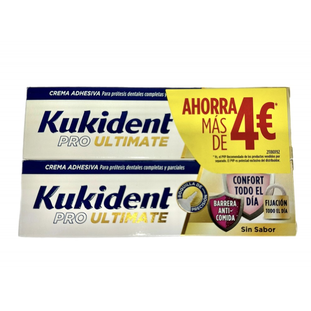 Revitaliza tu sonrisa y siente la libertad de vivir cada instante sin ataduras con Kukident Pro Ultimate Sin Sabor, presentado en un conveniente pack doble de 40 gramos cada uno.